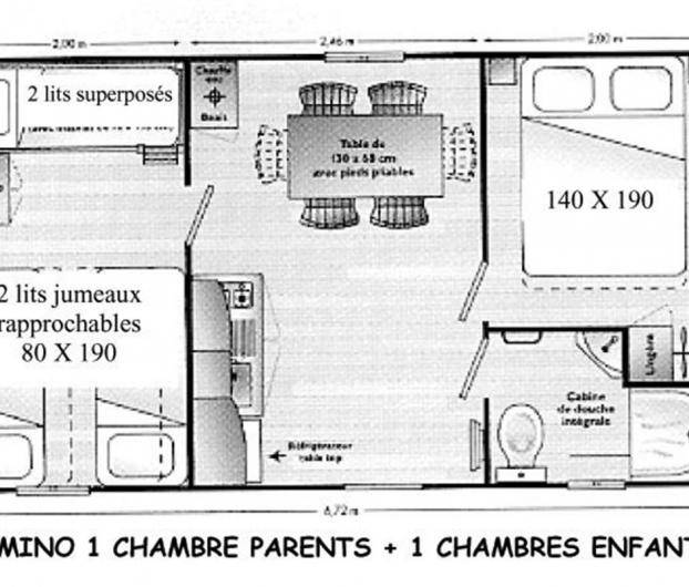 - 2 chambres/ 6 couchages : une avec un lit 140 cm, une avec 2 lits superposés de 70 cm et 2 lits de 80 cm (4 couchages dans la 2 ème chambre)